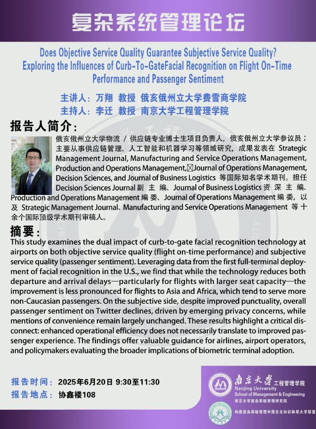 复杂系统管理论坛:Does Objective Service Quality Guarantee Subjective Service Quality? Exploring the Influences of Curb-To-GateFacial Recognition on Flight On-TimePerformance and Passenger Sentiment