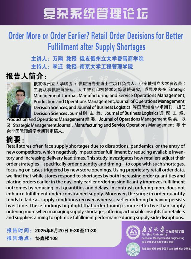 复杂系统管理论坛:Order Mlore or Order Earlier? Retail Order Decisions for BetterFulfillment after Supply Shortages