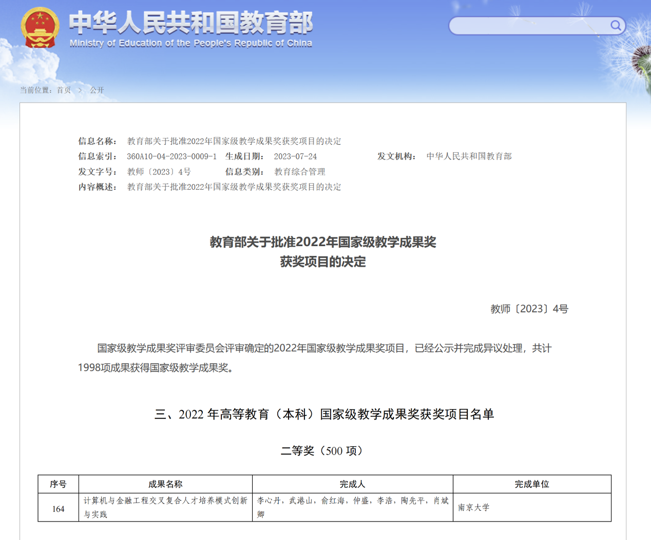 2023年7月24日,2022年高等教育国家级教学成果奖正式公布。根据教育部教师(2023)4号“教育部关于批准2022年国家级教学成果奖获奖项目的决定”,suncitygroup太阳集团和计算机科学与技术系联合申报的教学成果《计算机与金融工程交叉复合人才培养模式创新与实践》荣获高等教育(本科)国家级教学成果奖二等奖。该项目的主要完成人为李心丹,武港山,俞红海,仲盛,李浩,陶先平,肖斌卿。