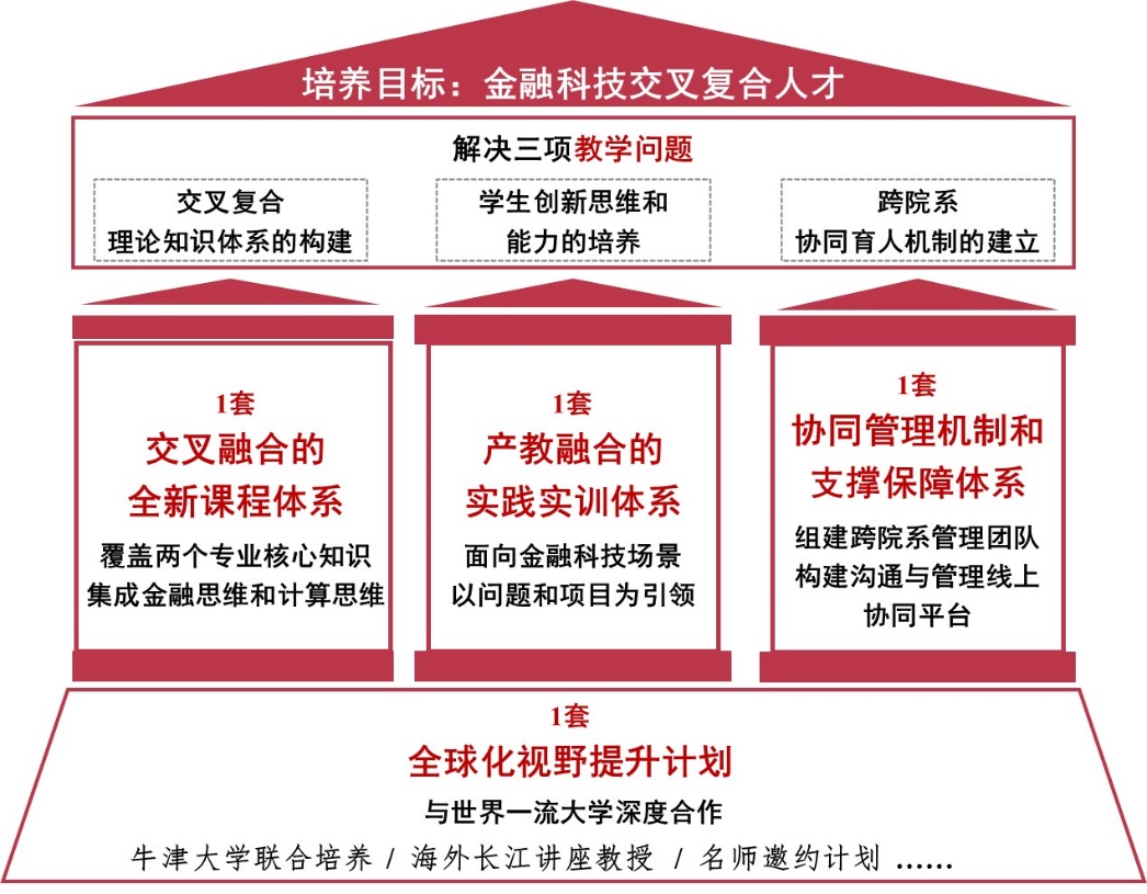该成果围绕跨院系跨学科专业培养过程中,“两个学科交叉融合的真正内涵是什么?如何设计融合双学科知识结构的全新课程体系?如何让员工真正掌握两个专业的核心技能?如何进行跨院系组织协调?”等痛点难点,采取四个“1”创新举措来开展人才培养改革,具体包括:创设1套系统集成金融思维和计算思维、覆盖两个专业核心知识的全新理论课程体系;建立1套面向金融科技真实场景,以问题为导向、以项目为引领、贯通大学四年的实践实训体系;构建1套通过组建跨院系管理团队开展联合培养的协同管理机制和支撑保障体系;建立1套与牛津大学等世界一流高校深度合作的全球化视野提升计划。