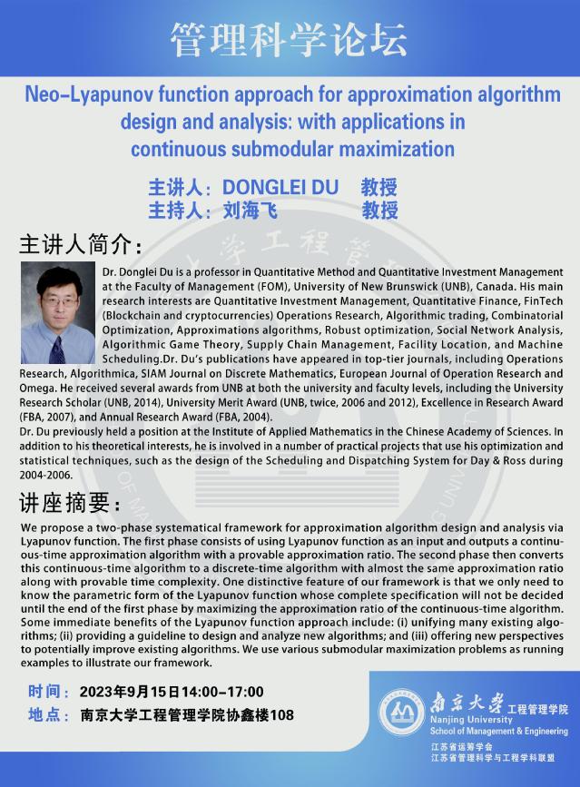 管理科学论坛:Neo-Lyapunov function approach for approximation algorithm design and analysis: with applications in continuous submodular maximization