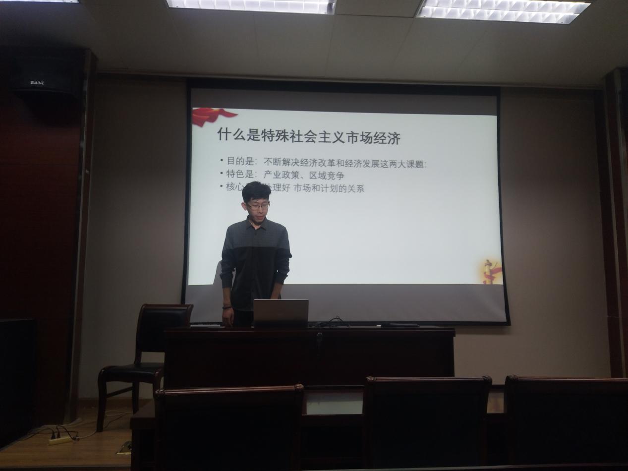 活动中,2018级硕士生第二党支部书记裴华飞同学为大家上了一堂生动的党课。他以“中国特色社会主义经济到底特色在哪里?”、“强政府和强市场是不是对立面?”、“西方是靠自由市场实现国家复兴的吗?”等三个问题引出党课主题,并结合专业所学对上述问题作了阐述。他说,经济建设要注意处理好市场和计划的关系,从张迎维和林毅夫关于产业政策不同的看法能得知产业发展中政府扮演指导和干预的双重角色,区域政府有着“准企业”和“准国家”的“双重角色”、市场竞争的“双重主体”作用。建立“双强”运行机制,能有效避免政府过度干预所带来的弊端。