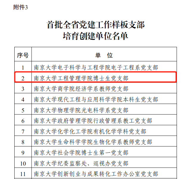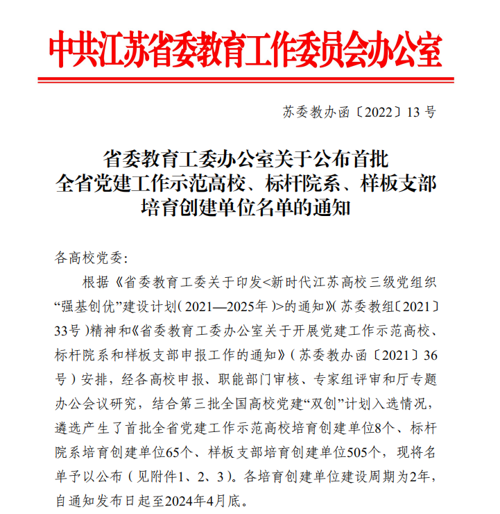 近日,江苏省委教育工作委员会办公室公布了《省委教育工委办公室关于公布首批全省党建工作示范高校、标杆院系、样板支部培育创建单位名单的通知》,suncitygroup太阳集团博士生党支部成功入选首批全省党建工作样板支部培育创建单位,这是公司基层党建工作取得的又一项重要成绩。