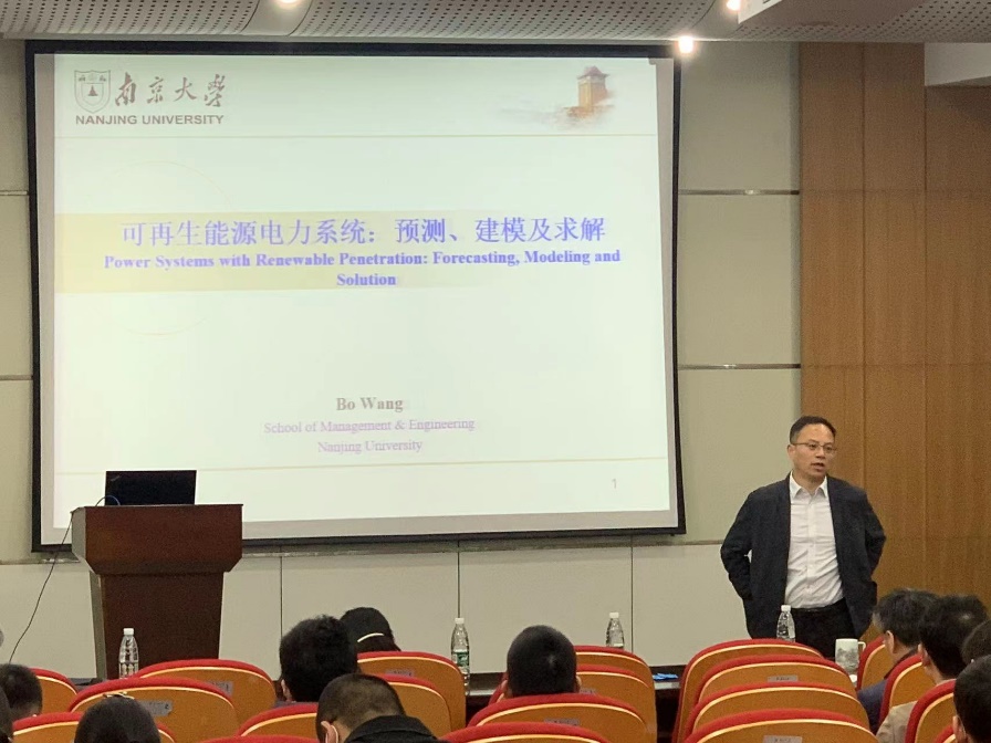 随后,第一位汇报人王博副教授分享了报告《可再生能源电力系统:预测、建模及求解》。王博副教授的报告立足于可再生能源发电规模的不断扩大催生出的对现阶段电力系统进行优化调度的需求。报告主要从风电、光伏、负荷预测,电力系统优化调度建模及求解算法三个层面进行,包括:针对不确定信息的点预测、区间预测及场景生成;不确定性下的随机优化、鲁棒优化、分布鲁棒优化建模;以及基于数学优化方法、进化计算、(深度)强化学习的求解算法设计等。