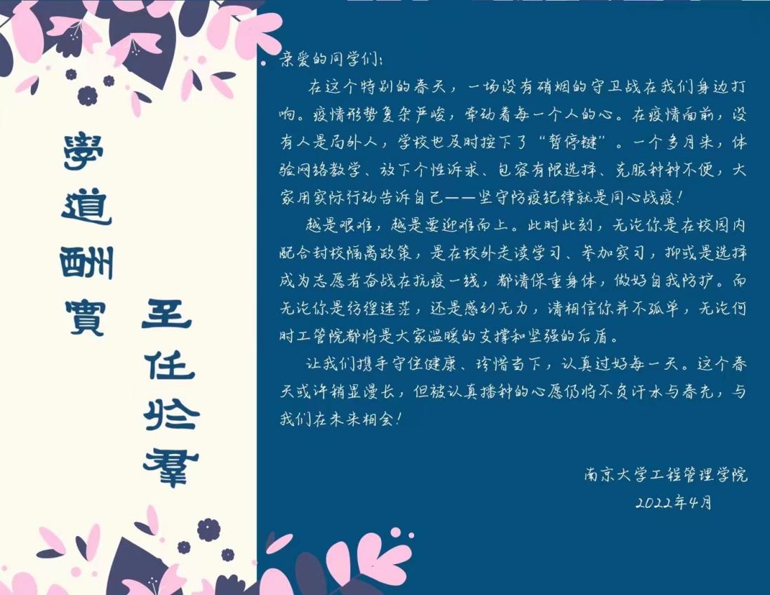 暖心慰问,爱在工管。老师们还特意地在每位同学的礼包中放入了一封“春日信笺”,见字如面,让我们携手守住健康,珍惜当下,认真过好每一天。
