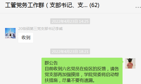 疫情期间,院校的相关通知也变得多了起来。从一开始的提醒大家每日健康打卡,到转发院校防疫政策,再到提醒大家参加常态化核酸。通过不断摸索,我不断优化工作流程,提炼通知内容、精简待办事项,争取让同学们对通知内容有更好的理解与反馈。我相信在我们的共同努力下,疫情终将被战胜,我们的通知里面再也看不到疫情的字眼!