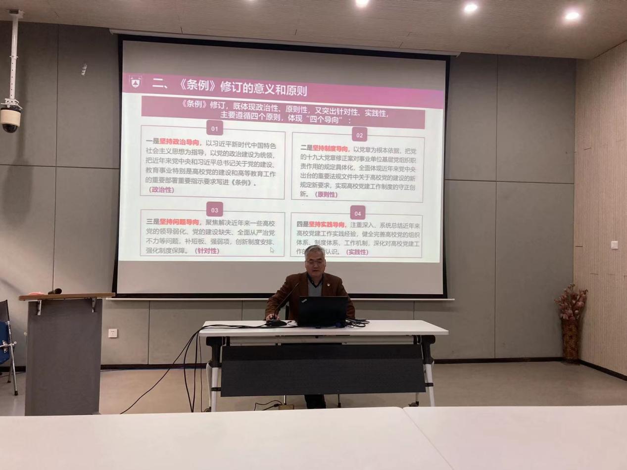 陈伟首先对《中国共产党普通高等公司基层组织工作条例》进行解读,从历史视角、宏观视角、发展视角和实践视角四个视角出发,分别介绍了《条例》修订的背景和过程、修订的意义和原则、主要修订变化和重点内容。他指出,《条例》的修订和实施,对于全面贯彻党的教育方针,落实立德树人根本任务,建设高质量教育体系,培养社会主义建设者和接班人,具有非常重要的意义,表示作为高公司党组织应当强化政治功能,推动师生党员树立党员先进的形象。