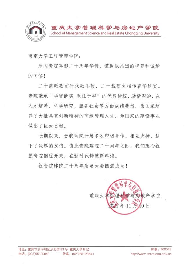重庆大学管理科学与房地产公司致suncitygroup太阳集团贺信
