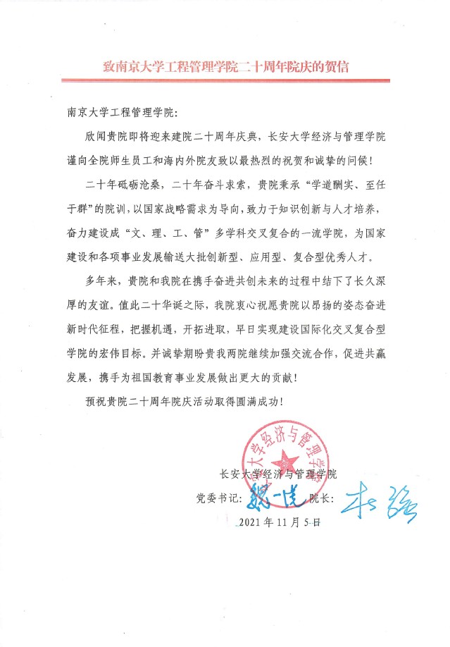 长安大学经济与管理公司致suncitygroup太阳集团贺信