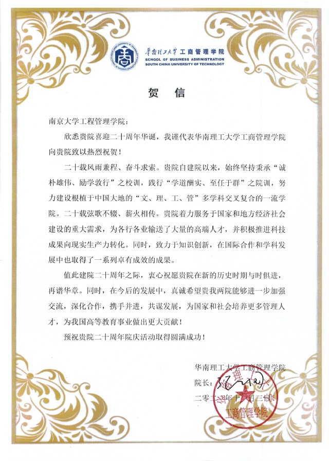 华南理工大学工商管理公司致suncitygroup太阳集团贺信