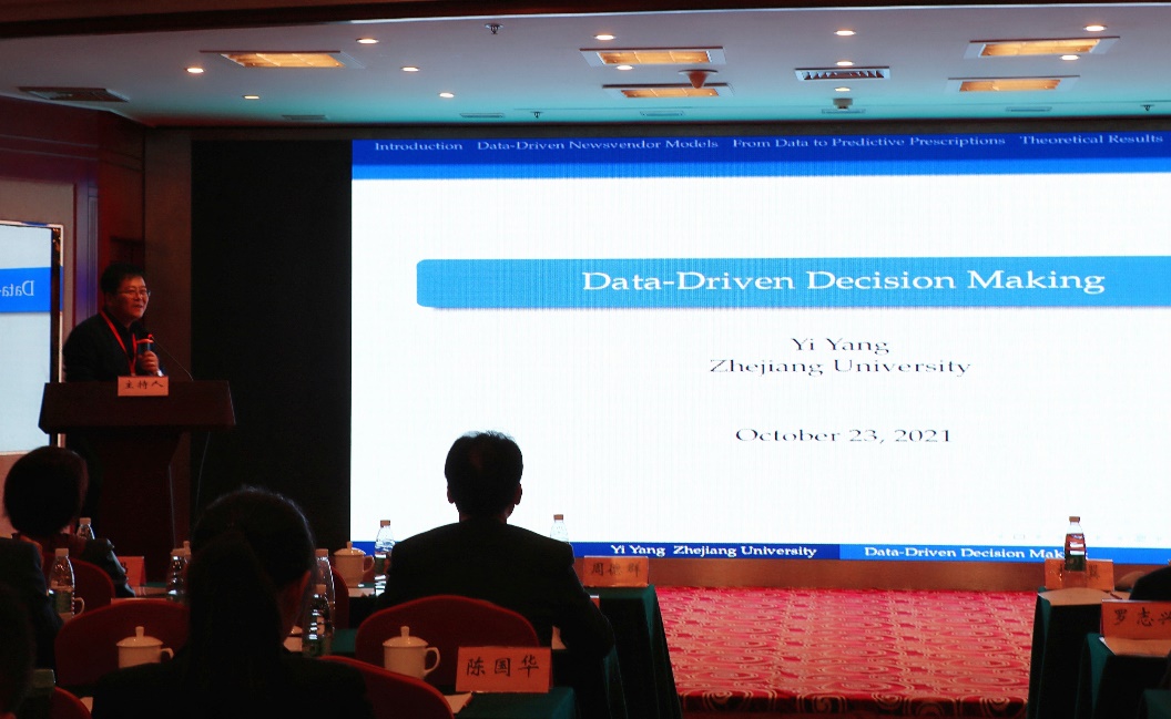 在主题报告环节中,国家杰出青年基金获得者、浙江大学管理公司杨翼教授以《Data-Driven Decision Making》为题进行报告,从报童模型出发,详细介绍了复杂条件下的决策模型与数据驱动算法,指出大数据背景下数据驱动思维方法的必要性与优越性。