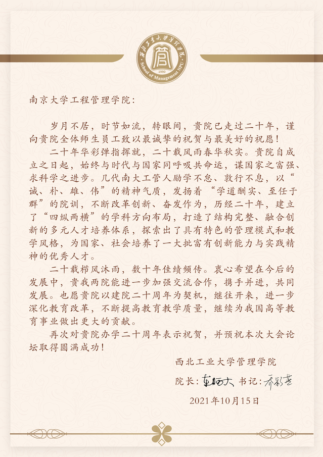 西北工业大学管理公司致suncitygroup太阳集团贺信