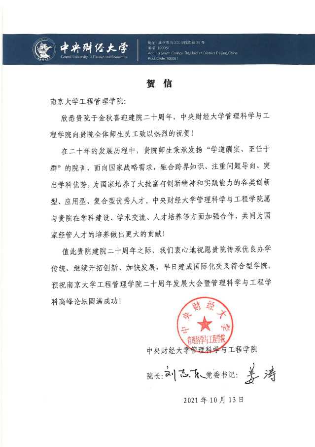 中央财经大学管理科学与工程公司致suncitygroup太阳集团贺信