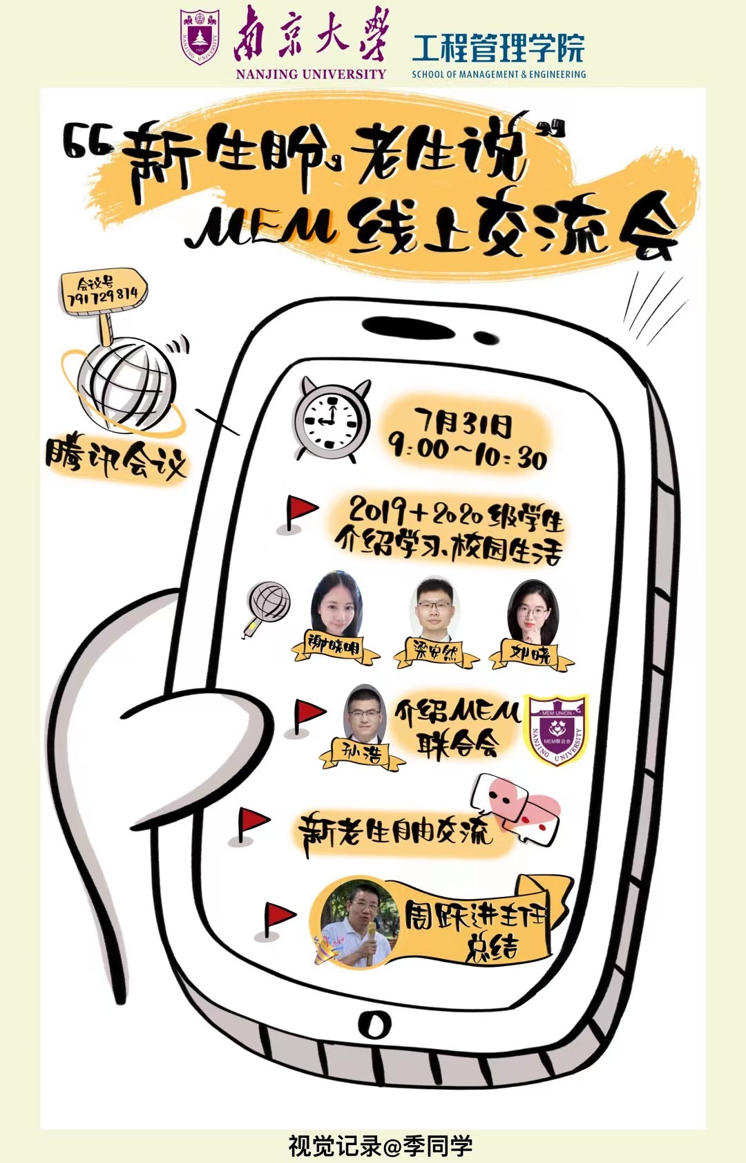2021年7月31日上午9点,“新生盼老生说”MEM交流会在腾讯会议平台举行,MEM中心执行主任周跃进教授、教务员王妙转、贾俊洁、优秀MEM员工代表及2021级新生参加了本次交流。