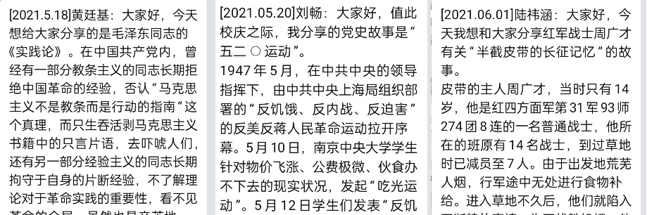 4月23日,支部启动“学党史 悟思想 话初心”线上圆桌会,每天由一位党员领学党史。同学们积极响应,纷纷从不同历史阶段、不同回顾视角收集素材,从被动学变为主动讲,并通过交流感想推动学习入脑入心。在已成为日常的学习分享中,党的精神力量浸润到每一位党员的灵魂深处,真正落实“以史为鉴、以学为基、向史而新”。