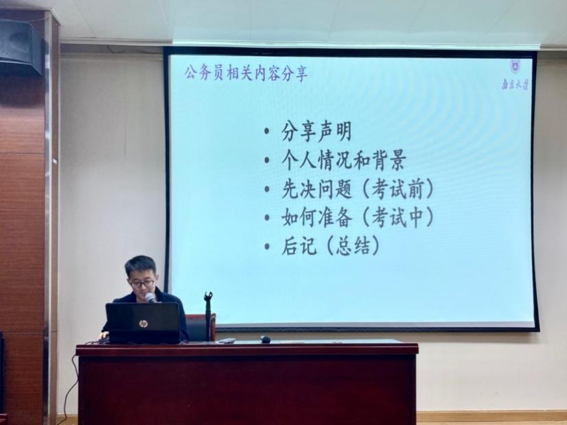获得湖北人才引进录取资格的刘琼结合自身经历分享了经验,他用幽默风趣的语言讲述了“考试前的先决问题”与“考试中的准备”,让同学们对形式有了大致框架。学长提出,选择和努力同样重要。作为党员,在就业选择中要不忘初心,牢记使命。在今后职业道路上,不忘个人初衷,踏实努力,实现自己的人生追求。