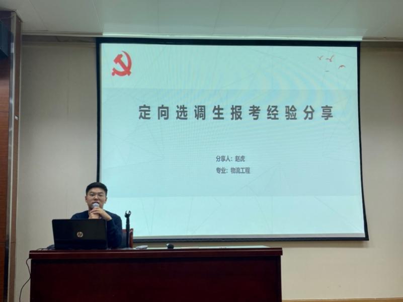 来自物流工程专业的赵虎已签约四川省定向选调生,他首先对“选调生是什么、如何准备”进行分享,随后详细展示了四川省急需专业的选调条件并提供备考方案。学长希望每位同学都能够尽快明确自身的职业规划,在员工工作及社会实践中锻炼自己践行党员义务,充分发挥桥梁纽带作用,并注重培养自身的家国情怀。