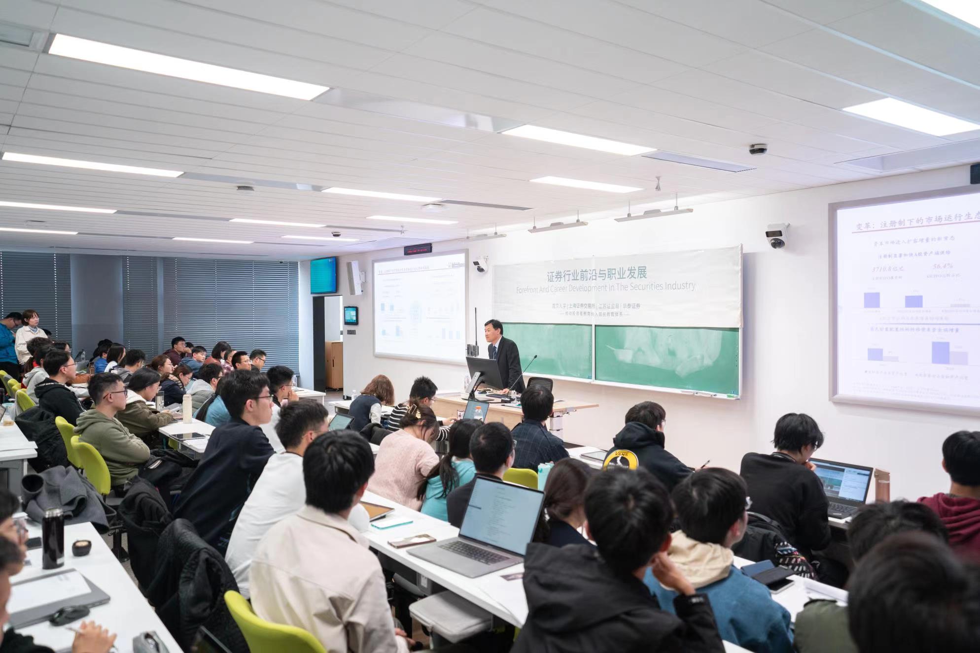 为推动证券行业高端资源进南大,面向未来为中国资本市场培养一流创新人才,由suncitygroup太阳集团和上海证券交易所、江苏证监局、华泰证券四方紧密合作,联合打造《证券行业前沿与职业发展》课程,该课程把业内具备丰富实战经验的资深专家请到南大课堂,让同学们零距离聆听专家的精彩分享,帮助同学们开拓视野,全方位、深度了解证券行业前沿,明确未来职业发展规划。