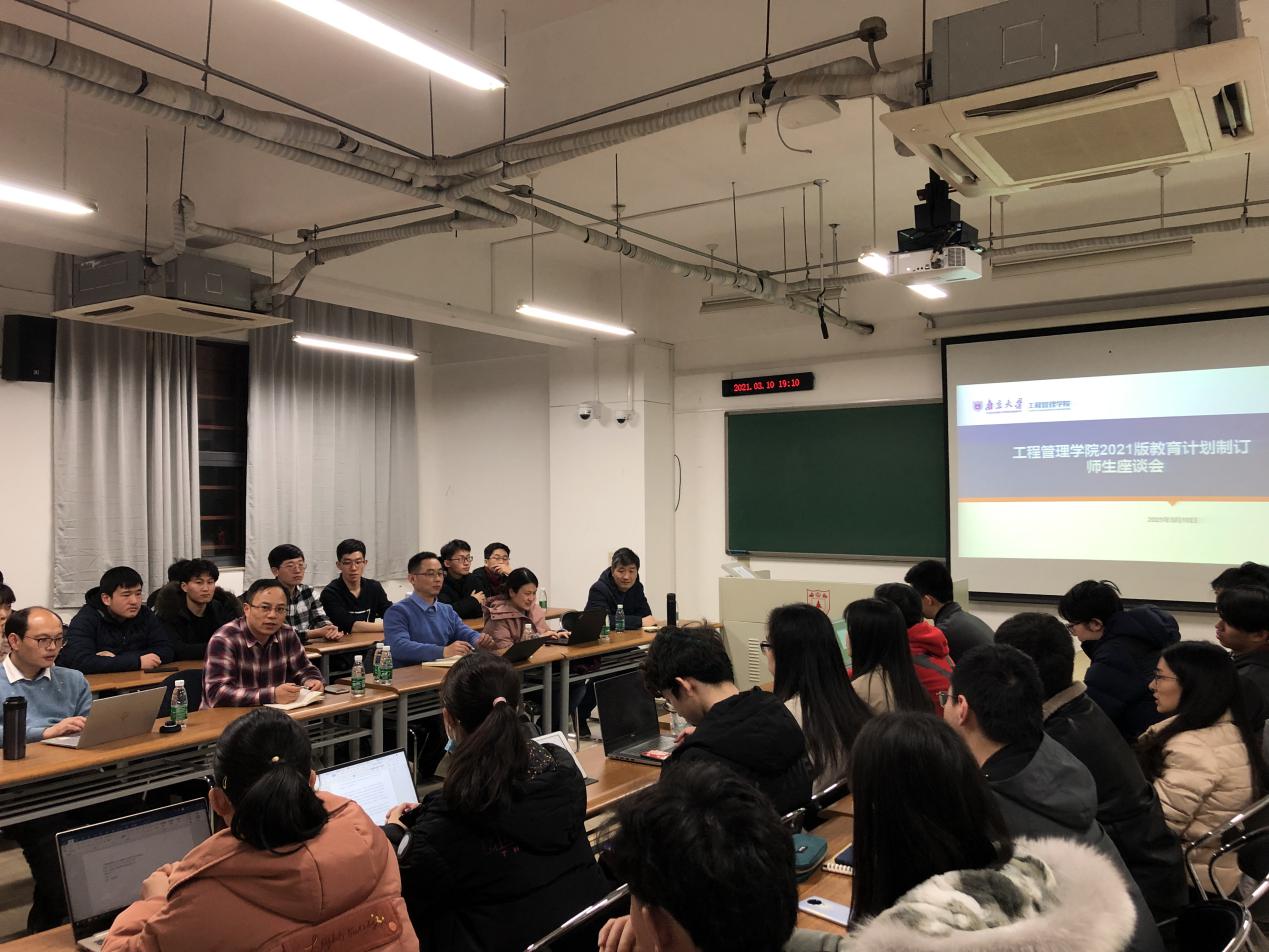 为了全面提升本科公司产品质量,推动2021版公司产品计划的制订工作,2021年3月11日晚,suncitygroup太阳集团2021版本科公司产品计划制订师生座谈会在逸夫楼C104教室召开。公司教学经理俞红海、工业工程教研室主任徐薇、自动化教研室主任李华雄、金融工程教研室副主任方立兵、实验教学中心副主任李民、辅导员丁驰、教务员蔡睿璇,以及来自金融工程、工业工程、自动化和计算机与金融工程实验班各年级40余名员工参加了本次座谈会。座谈会由俞红海教授主持。