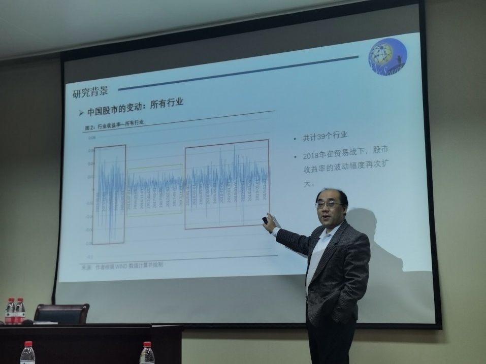 周颖刚教授首先介绍了中美贸易摩擦的背景及历程:截至2019年底,美方对中国进行了五轮加征关税、出台了多项制裁措施。进而,周教授提出了三项研究问题:(1)中美间汇市、股市在贸易摩擦期间均出现了显著的变化,汇率变动是否对中美股市产生显著影响,中美股市谁的损失更大?(2)汇率变动通过怎样的渠道对各行业的股市收益率产生影响?(3)贸易摩擦中未受波及的行业也受到显著影响的原因有哪些?