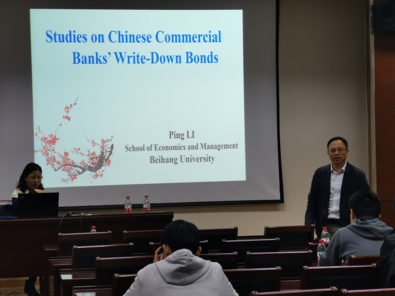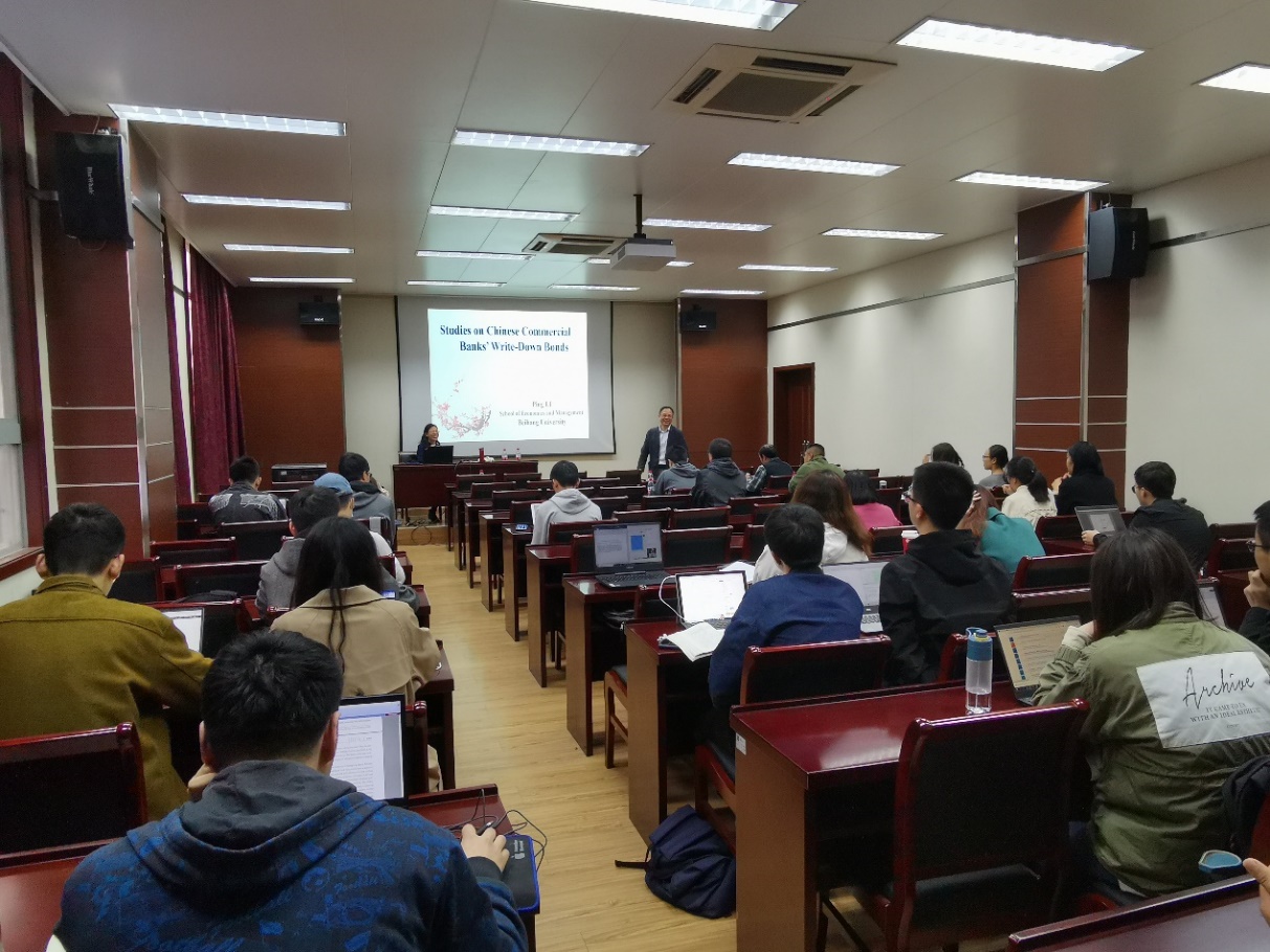 在讲座最后,李教授对现场师生的提出的问题进行解答,并建议银行和金融机构对发行CoCo债券的客户对象的范围做好控制。最后,主持人俞红海教授表达了对李平教授的感谢,也建议对该领域的问题感兴趣的同学多多向李平教授请教。