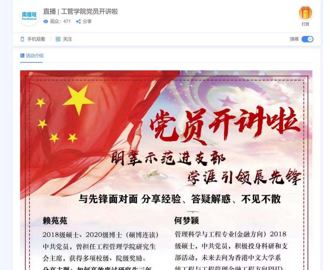 此次活动分为嘉宾分享、交流互动和书记致辞三个环节。公司党委书记陈伟、公司副书记陈力立、公司党委专职组织员饶雨夏与会。在校生赖苑苑、何梦颖、陶艳萍和刘煜昊作为分享嘉宾应邀参加活动。两个支部的全体党员现场参加活动,同时有四百余名其他支部的党员通过南播玩直播线上参与活动。