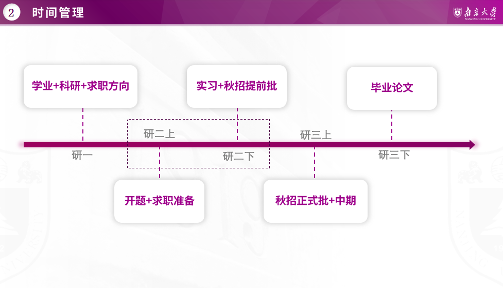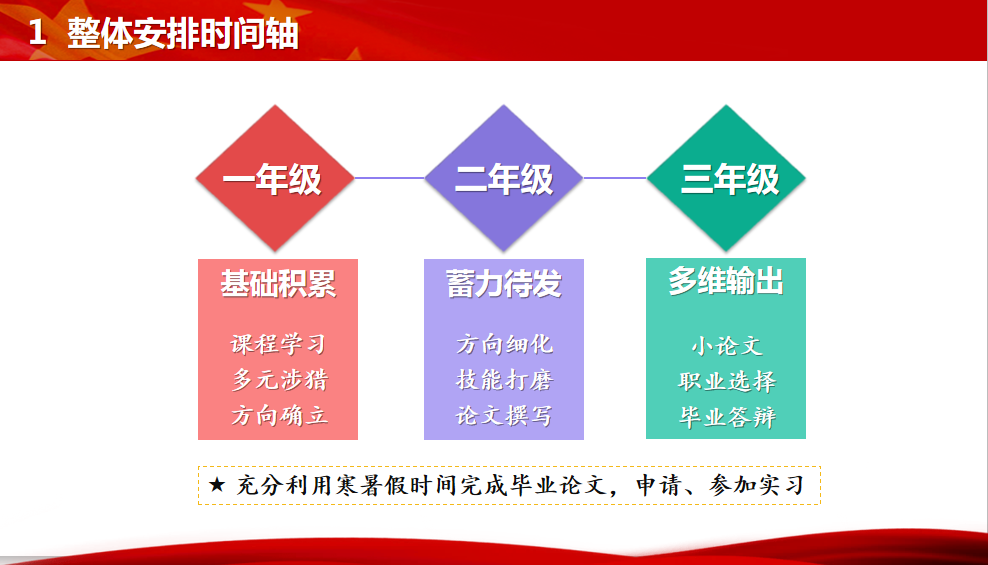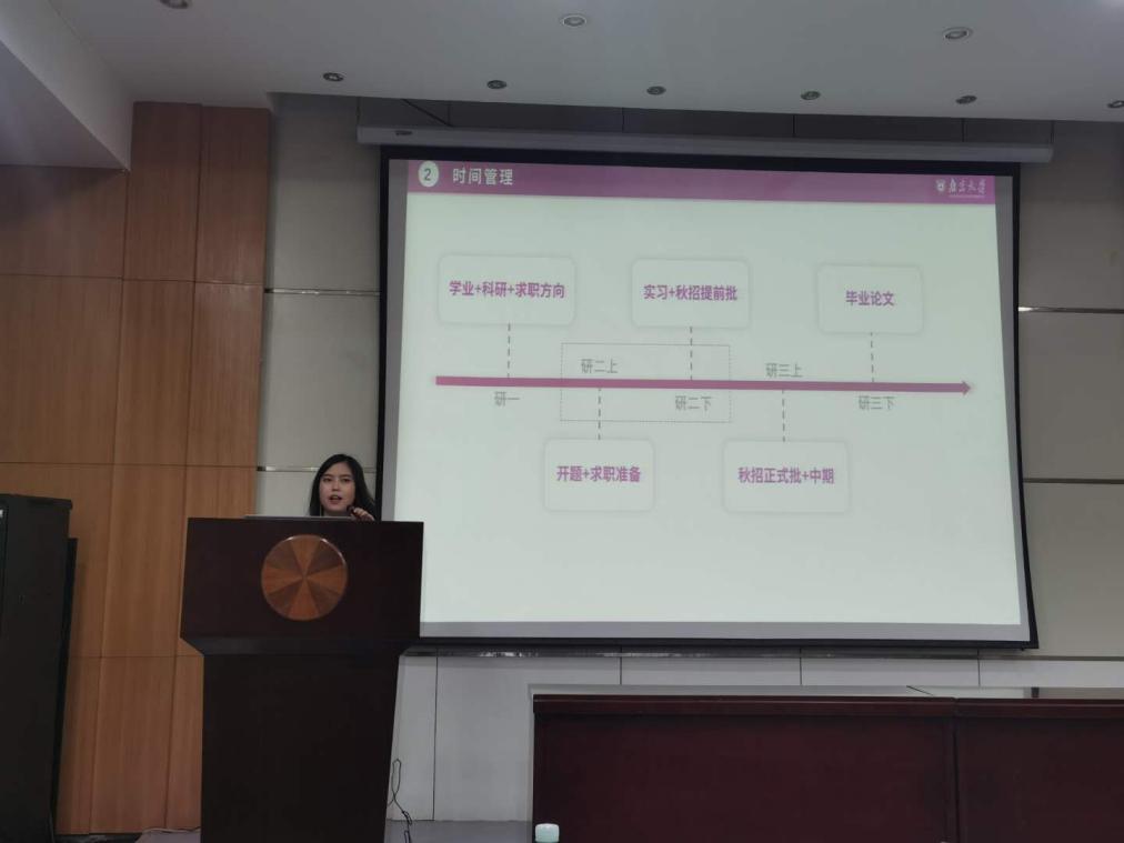 原公司研究生会主席赖苑苑带来了“如何高效度过研究生三年——开启工管人时间轴”主题分享,她从研究生整体安排时间轴、技能提升时间轴、论文写作时间轴以及考博求职时间轴等四个角度分享了自己的学习和工作经验。她表示:三年研究生学习时间十分短暂,要尽早做好是否读博的决定,充分利用课余时间全面提升自己,找准开启研究生高效时间轴的关键因素。