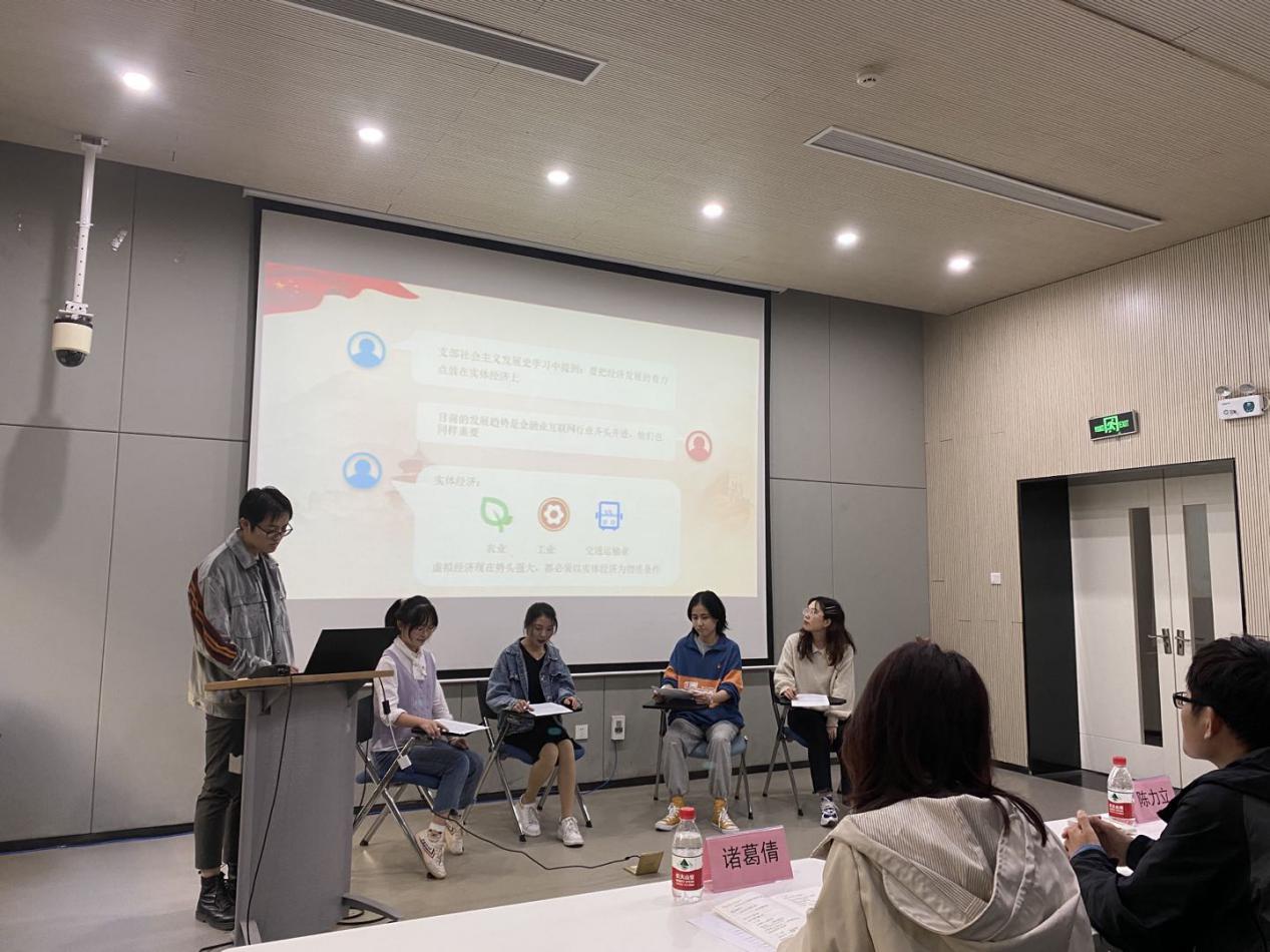 2019级硕士生第四党支部柯兴萍等多位党员为大家带来了新颖生动的圆桌讨论《是否要把发展经济的着力点放在实体经济上》,结合金融行业和互联网行业发展现状,对实体经济与虚拟经济之间深层次的关系展开讨论。在紧张激烈的讨论后,她们得出结论:虚拟经济在社会主义发展过程中有着重要的地位,实体经济始终是人类社会赖以生存和发展的重要基础,国家经济发展的着力点也应该放在实体经济上。
