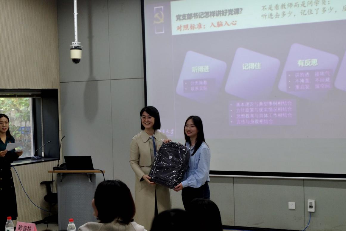 陈力立书记在点评的同时,讲述了上好党课的重要性。她说,衡量一堂党课是否合格的标准是立场是否正确以及是否入脑入心,她建议从宏观、中观、微观三个层次入手,把握大处着眼、小处着手的要求,体现时代性和需求性,以适合的形式与节奏讲好党课。针对微党课讲演的具体内容,她肯定同学们备课充分、理论扎实,能够感受到情感的真挚。党课中提到的南大哲学系胡福明老师推动的思想解放运动的实例,能够引发作为南大人的骄傲与自豪。结合党课中有关中国工业发展的内容,她希望同学们多深入产业与行业,充分了解中国行业的发展所需、树立正确的就业观和价值观,争取获得不断进步。