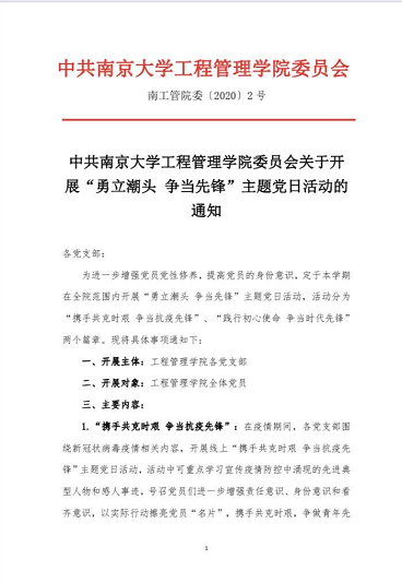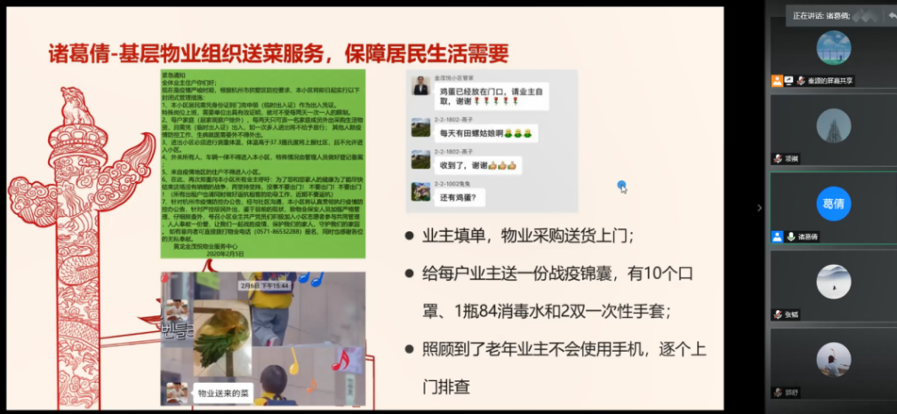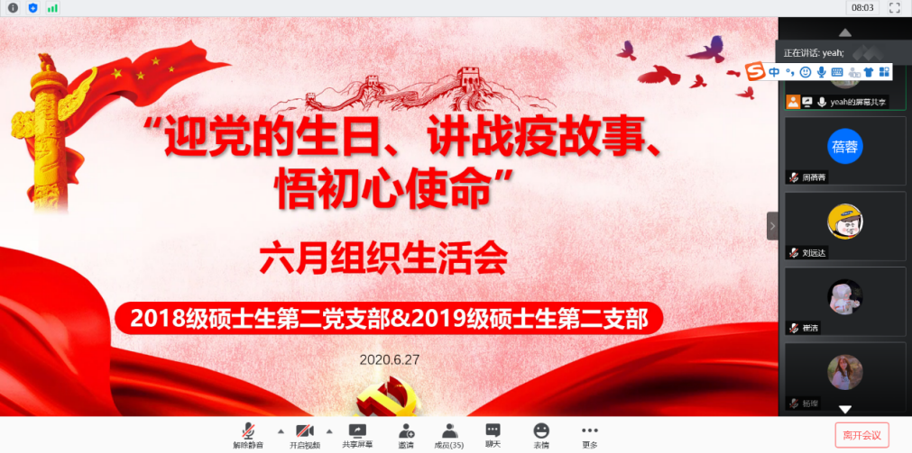 除了听抗击疫情的故事,在各支部的组织生活会上,党员们也纷纷讲述了自己的感悟和身边的故事。在2019级硕士生第三党支部的组织生活会上,吴超同学讲述了疫情期间祖国心系海外职工的点点滴滴;吴祥同学介绍了自己家乡疫情防控的举措;张慎同学讲述了疫情期间,南老员工自发组织捐款捐物资团体支援湖北的行动;马思慧同学讲述了疫情初期医院物资紧缺,医护人员自制护具抗疫的感人故事;张韬同学讲述了他的同学参加武汉火神山、雷神山医院建设的事迹;诸葛倩分享了自己所在小区基层物业组织送菜,保障居民生活需要的故事。大家深有感触,表示岁月静好的背后是有人在替我们负重前行。