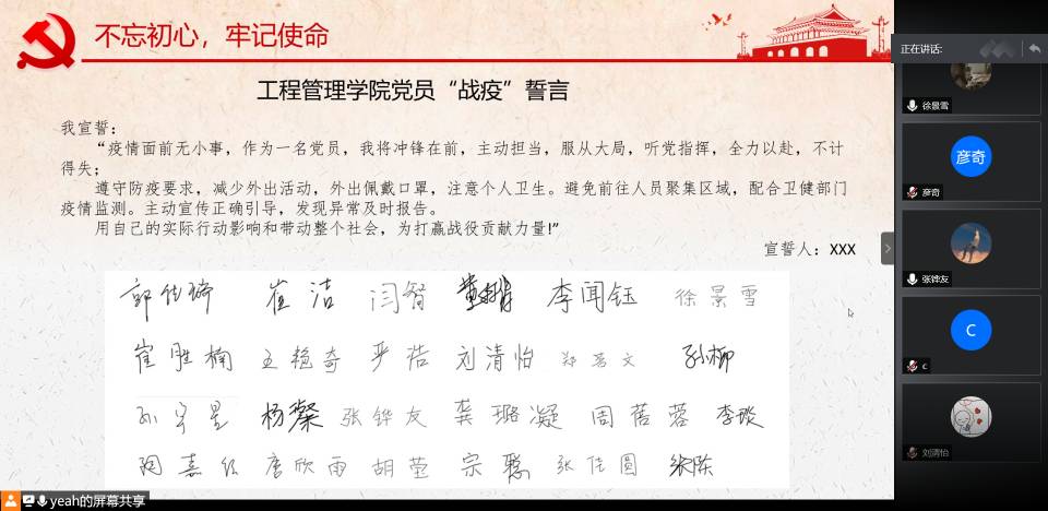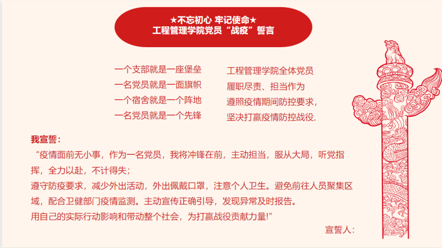 公司党委副书记陈力立组织起草了《公司党员“战疫”誓言》,对于构筑一道红色防火墙也有着自己的解读。她认为一个支部就是一座堡垒、一名党员就是一面旗帜、一个宿舍就是一个阵地、一名党员就是一个先锋。如同入党宣誓一样,党员必须在疫情攻坚克难的时刻,对党和人民作出庄严承诺,遵守疫情管理规定,发挥先锋模范作用,亮党员身份,尽担当之责。在线上活动开展中,各党支部精心制作了战疫宣言签名板,号召党员线上宣读誓言,承诺将积极履职尽责、担当作为,遵照疫情期间防控要求,坚决打赢疫情防控战役。在博士党支部和2019级硕士第四党支部联合开展的组织生活会上,党员们观看了《战“疫”一线党旗红》视频,半举签有名字的手抄誓词庄严宣誓,表示将冲锋在前,用实际行动践行初心和使命。