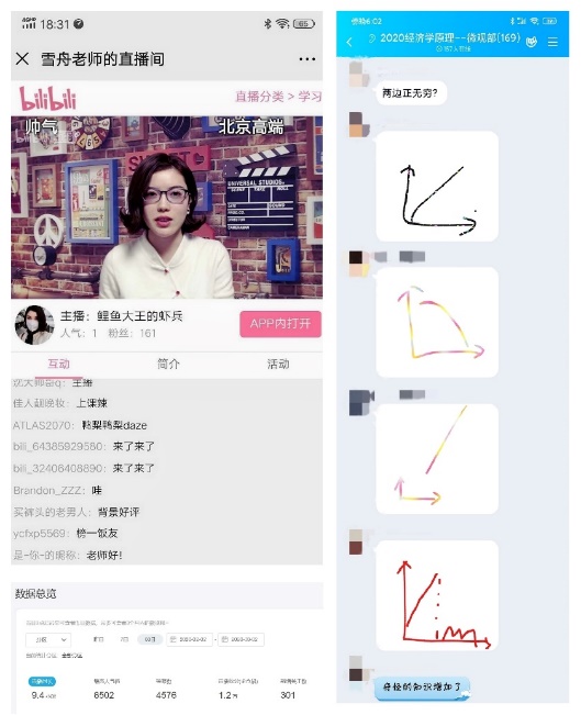 赵雪舟老师本学期正在为163位工科试验班的同学讲授《经济学原理》的微观部分。在征求了同学们的意见之后,她选择了哔哩哔哩网站直播授课。课前,她通过教学立方发布课件,通过QQ群督促大家预习;课上,鼓励大家通过弹幕和QQ群,实时反馈听课过程中的问题;课后,要求邮件提交作业,并在第一时间批改反馈。另外,赵老师很贴心的对直播录屏,并上传教学立方,供同学们课后复习之用。她采用课堂电子签到、集体在线小测、花样十足的个别提问,增强师生课堂互动,在线教学气氛亦庄亦谐。赵老师对于线上教学也颇有一些感触。她表示,师生虽分处网络各端,看似地理距离远了,但互动的参与者变多了,密度也增强了。囿于疫情,虽然只能线上教学,但这也是一种新的教学语言的使用。接下来的课程中,她会在如何把握课堂节奏,比如对哪些弹幕作出即时回应;如何提升上镜的心理素质,说话是否流畅有逻辑等方面进一步加强。