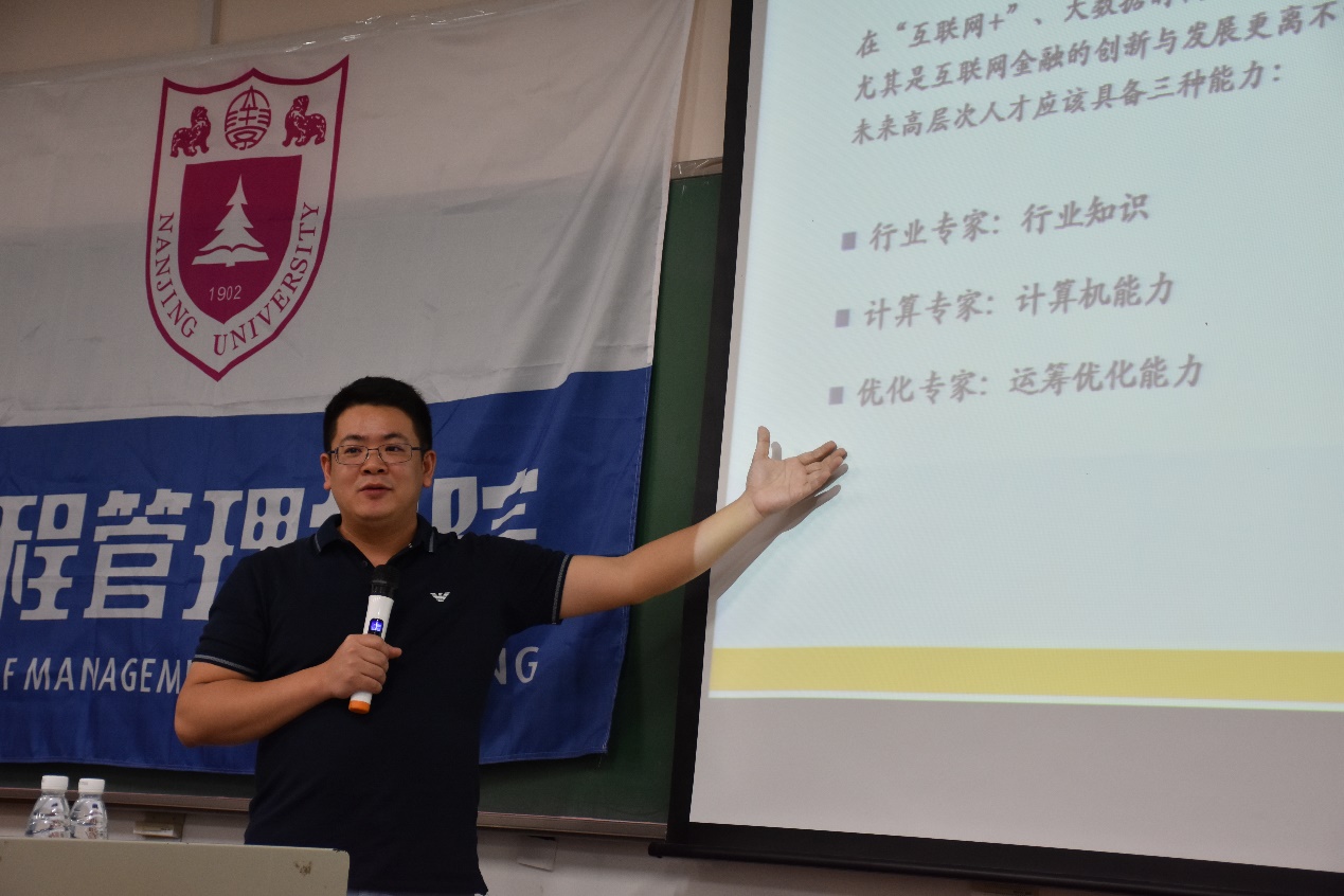 随后,为了帮助同学们更加明确能力发展的方向,班主任肖斌卿向同学们详细讲解了Fintech人才能力素质模型,结合行业和领域的新发展对人才的新要求提出了Fintech人才需要具备的若干核心能力。再次强调了实验班的培养理念是培养具有远见的高层次、复合型、国际化计算机与金融工程领域专业人才,班级特色是宽口径知识基础、前沿课程体系、深度交叉融合课程、一线行业企业实训。