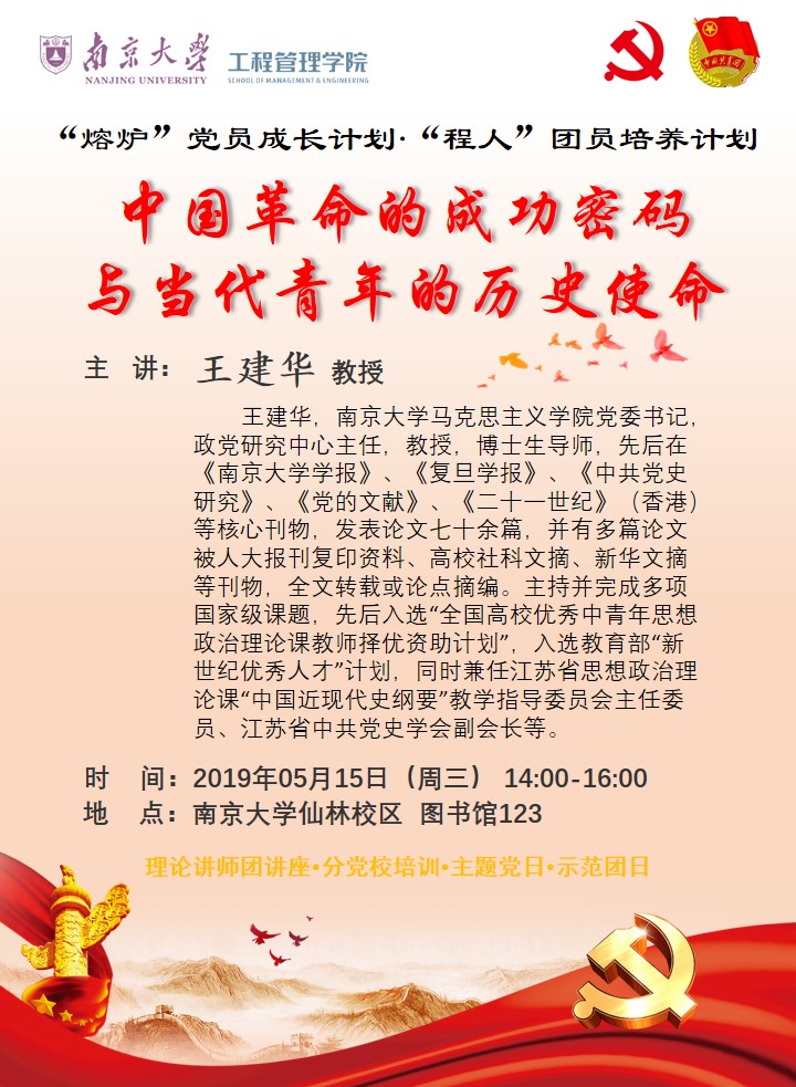 为发挥组织育人实效,推进“熔炉”党员成长计划和“程人”团员培养计划,公司党委红色生涯课堂于2019年5月15日下午2:00在杜厦图书馆123教室正式开讲。本次党课邀请到suncitygroup太阳集团理论讲师团讲师、马克思主义公司党委书记、政党研究中心主任王建华教授讲授《中国革命的成功密码与当代青年的历史使命》,本科生党支部全体党员、发展对象、入党积极分子、入党申请人及2017级本科生全体参加,活动由公司党委副书记陈力立主持。