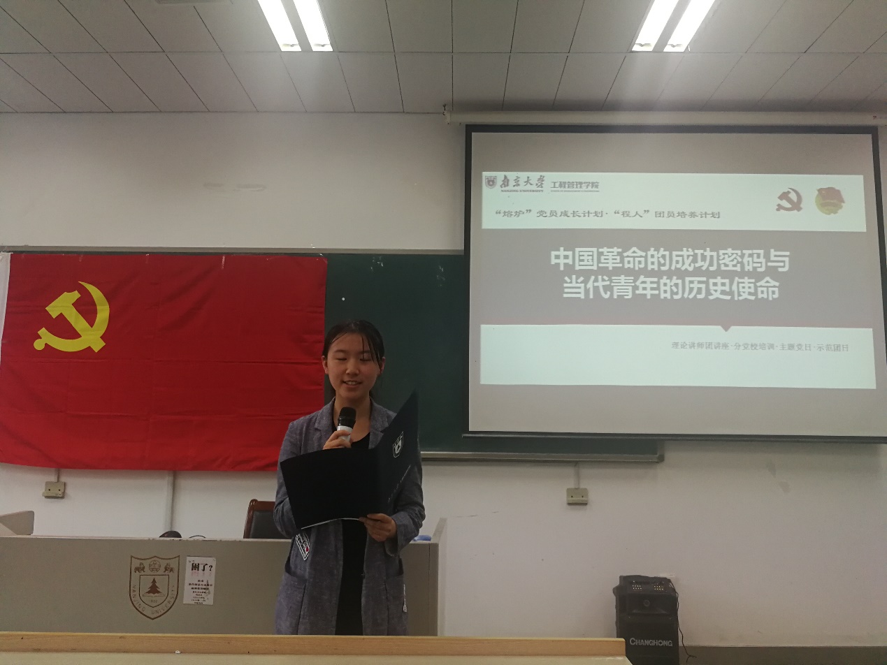 随后,本科生党支部预备党员周鹏同志和2017级本科生入党积极分子李安祺同学分别发表了“以当代青年的历史使命”、“第一个南大、我的责任”为主题的演讲,号召同学们树立理想,学会担当,勇于担当,使自己具备高度的政治觉悟与不怕牺牲的意识,作为民族最积极最有生气的力量,为国家建设添砖加瓦。