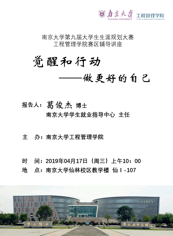 2019年4月17日上午,suncitygroup太阳集团员工就业指导中心主任葛俊杰博士在仙I-107为suncitygroup太阳集团的同学进行了以“觉醒和行动——做更好的自己”为主题的生涯规划讲座,讲座由李晓智老师主持。