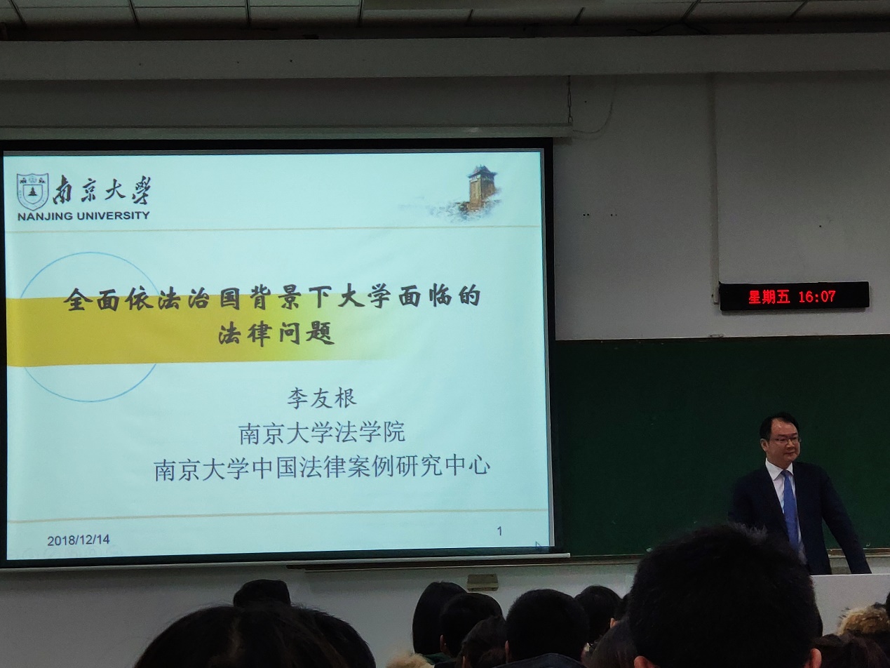 李有根教授以校园内违法事件、高校员工网络贷款事件等案例开篇,提出“事件涉及哪些法律意识”、“为何频出此类事件”等问题并予以解答,就案例行为进行法律评价,强调同学们要加强法律意识。十九大报告指出,全面依法治国是中国特色社会主义的本质要求和重要保障。全面依法治国是国家治理的一场深刻革命,必须坚持厉行法治,推进科学立法、严格执法、公正司法、全民守法。李教授从四个全面战略布局、全面依法治国的内涵、全面依法治国对高校的挑战等方面对全面依法治国与高等公司进行讲授,其中从社会对大学的期待、社会对大学的监督、党和政府对大学的要求等方面,员工与家长、高校教师、复杂的社会环境等维度,辅以案例阐述了全面依法治国对高校的挑战。