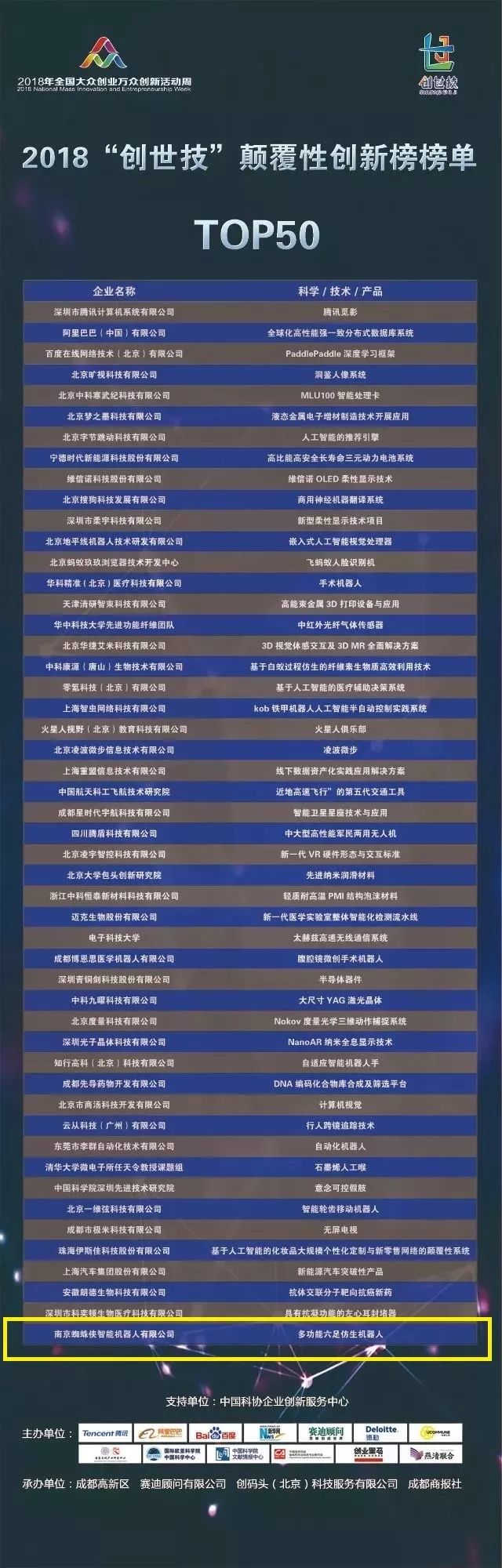2018年10月9日,以“高水平双创,高质量发展”为主题的2018全国大众创业万众创新活动周(以下简称“双创周”)在成都启动,中共中央政治局常委、国务院总理李克强对本次双创周作出重要批示,中央政治局常委、国务院副总理韩正出席启动仪式并讲话。11日下午, 2018“创世技”颠覆性创新榜发布会在菁蓉汇举办。会上,全国范围内首张颠覆性创新榜单——2018年颠覆性创新榜正式发布,suncitygroup太阳集团2016级研究生唐开强创办的南京蜘蛛侠智能机器人有限公司凭借“基于机器视觉与自主导航的多功能全地形仿生智能多足机器人”项目入选50强。据悉,本次颠覆性创新榜评选活动是国内首次,由腾讯、阿里巴巴、百度、新华网、赛迪、德勤中国、优客工场、清华大学、国际欧亚科公司等13家极具权威单位联合发起,百度、阿里巴巴、腾讯(BAT)、寒武纪、宁德时代等企业项目入选。