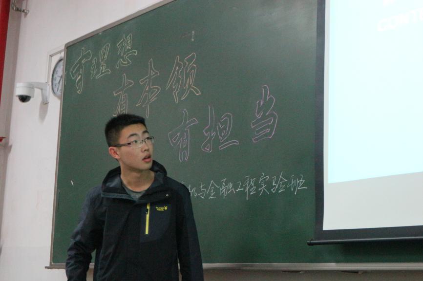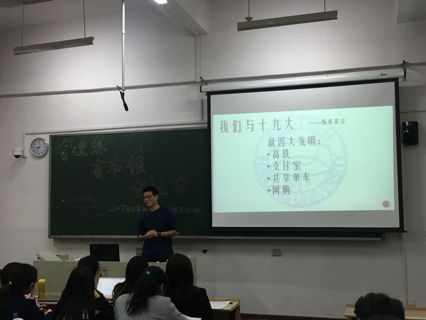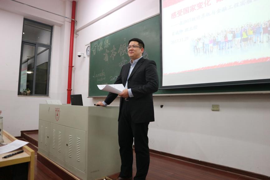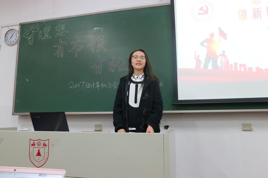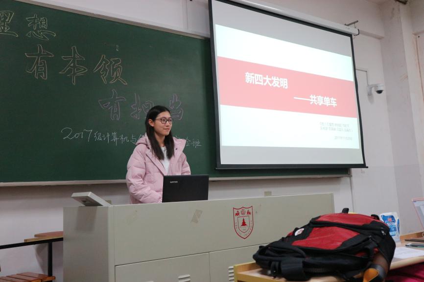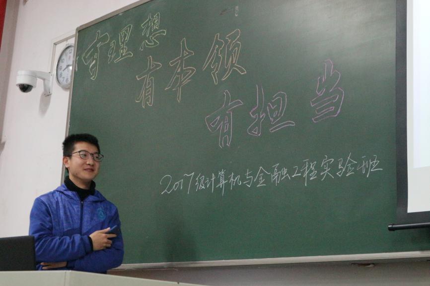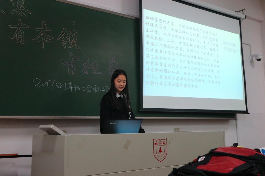 2017年11月29日晚,2017级计算机与金融工程实验班的同学与老师们举行了“感受国家变化,做新时代三有青年”主题班会。班会形式多样,内容丰富。 习主席在十九大讲话中提出了对新时代青年的期望:“青年一代有理想、有本领、有担当,国家就有前途,民族就有希望。”怎样才能成长为对自己负责、对社会负责的“三有”青年,是我们需要思考并解决的问题,此次班会正是围绕着为同学们指引正确的发展方向而展开的。 班会由班长马小堤主持,共分为四个部分展开:首先由团支部书记杨帆带领大家回眸十九大;其次全班分为四个小组,分别为大家分享介绍“新四大发明”——高铁、支付宝、共享单车、网购;随后由闫子琛同学为大家带来单口相声表演《我的三有人生》;最后由班主任肖斌卿老师为班会做总结发言,并与大家分享关于“有理想、有本领、有担当”的感悟和体会。