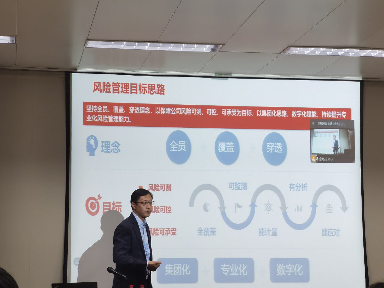 王翀先生首先向大家介绍了金融企业风险管理的整体概况。王先生指出,金融企业不仅要“规避风险”,更要“经营风险”,通过承担并管理风险创造收益。金融企业面临的风险种类多样,来源复杂。对此,华泰证券风险管理目标思路是:坚持全员、覆盖、穿透理念,以保障公司风险可测、可控、可承受为目标;以集团化思路,数字化赋能,持续提升专业化风险管理能力。在此思路指导下,华泰证券风险管理部门实行矩阵式的运作架构,纵向上专业化分工各业务线,横向上业务对口覆盖每一条业务线。
