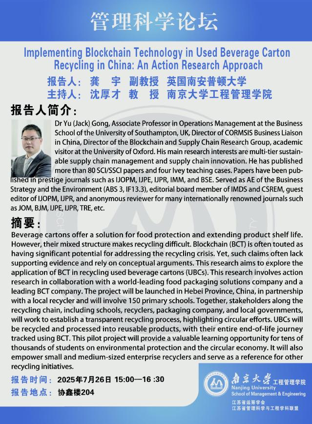 管理科学论坛:Implementing Blockchain Technology in Used Beverage Carton Recycling in China: An Action Research Approach