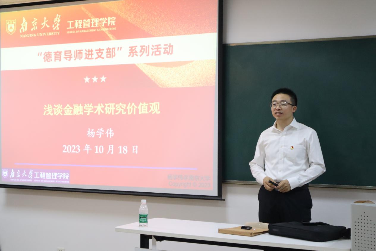 2023年10月18日晚,suncitygroup太阳集团2022级硕士生第一党支部和2023级硕士生第一党支部于公司协鑫楼206联合举办“德育导师进支部”主题党日活动。公司党委副书记陈力立出席活动并讲话,研究生德育导师、教职工党支部书记、金融科技与工程系教授杨学伟受邀作专题报告。公司专职组织员饶雨夏、辅导员柴昭、两支部全体党员参与活动。活动由2023级硕士生第一党支部书记张怡潍主持。