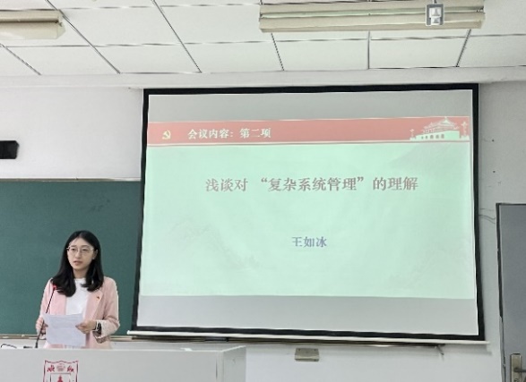 在会上,与会党员围绕复杂系统管理中国自主知识体系展开充分探讨,将学术理论扎根祖国大地。姜修齐和王如冰两位党员先后与大家讨论分享了自身对于“自主知识体系”和“复杂系统管理”的理解。