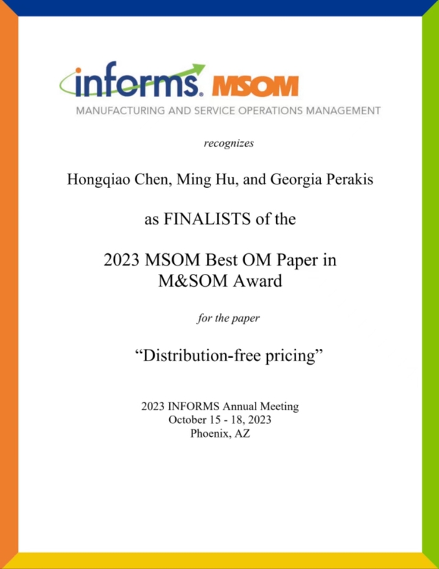 2023年10月15日至18日,美国运筹学与管理科学学会(Institute for OperationsResearch and the Management Sciences,INFORMS)年会在美国Phoenix举行。公司陈虹桥老师与多伦多大学胡明教授,麻省理工公司GeorgiaPerakis教授合作完成发表在Manufacturing & Service OperationsManagement上的论文“Distribution-Free Pricing”荣获2023年度制造与服务运作管理分会运营管理方向最佳论文提名奖 (FINALIST ofthe 2023 MSOM Best OM Paper in M&SOM Award)。该奖项授予过去三年发表在M&SOM上对运营管理理论与实践最具贡献的论文,先由M&SOM主编、区域主编、副主编投票产生3篇提名论文(第三名可并列),再从中选取最佳论文。