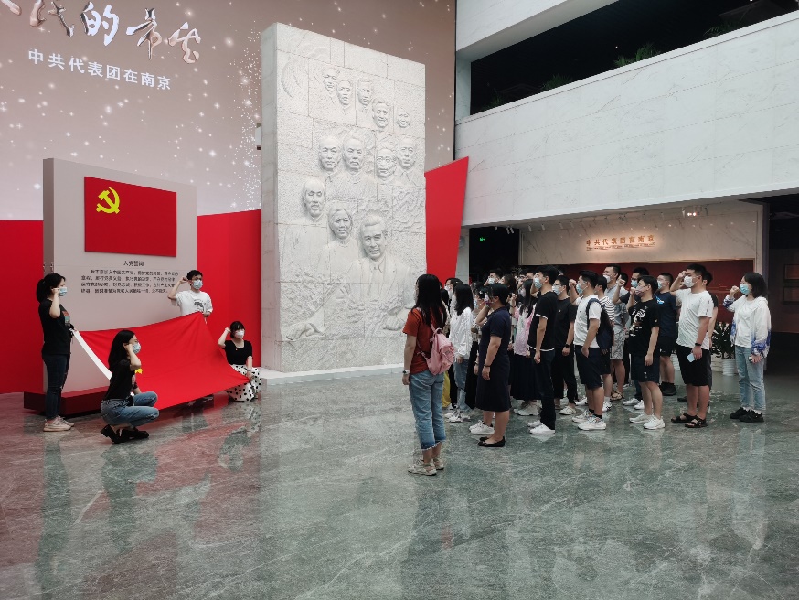 最后,同学们回到国共南京谈判史料馆中央大厅,在这里重温入党誓词。全体党员面向党旗,举起右拳,用嘹亮而坚定的声音庄严宣誓:“我志愿加入中国共产党,拥护党的纲领,遵守党的章程,履行党员义务,执行党的决定,严守党的纪律,保守党的秘密,对党忠诚,积极工作,为共产主义奋斗终生,随时准备为党和人民牺牲一切,永不叛党。”