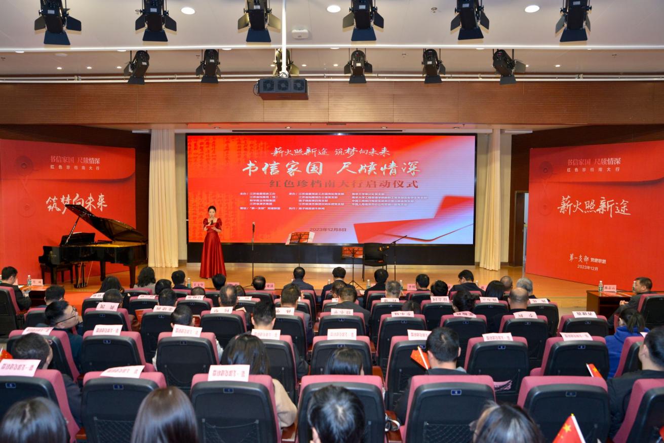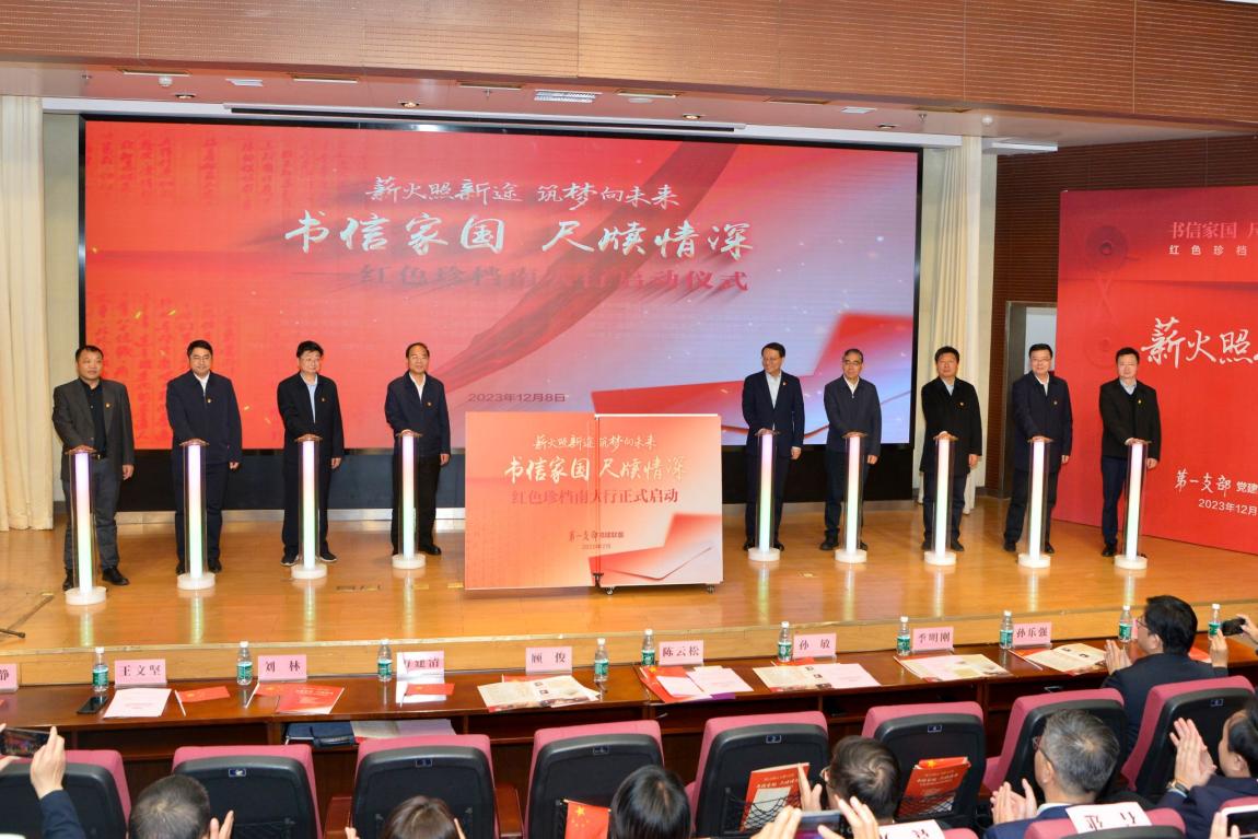 suncitygroup太阳集团党委副书记陈云松、江苏省档案局局长、江苏省档案馆馆长顾俊、江苏省委党史工作办公室一级巡视员万建清、江苏省档案馆副馆长孙敏、省委省级机关工委二级巡视员刘林、新华日报社党委委员、扬子晚报总编辑王文坚、江苏省演艺集团党委副书记、董事季明刚、suncitygroup太阳集团审计处党支部书记骆威、suncitygroup太阳集团公司党委书记陈志云共同上台,按下启动按钮,“《书信家国 尺牍情深》红色珍档南大行”活动正式启动。启动仪式在全场合唱《我和我的祖国》的激昂歌声中落下帷幕。