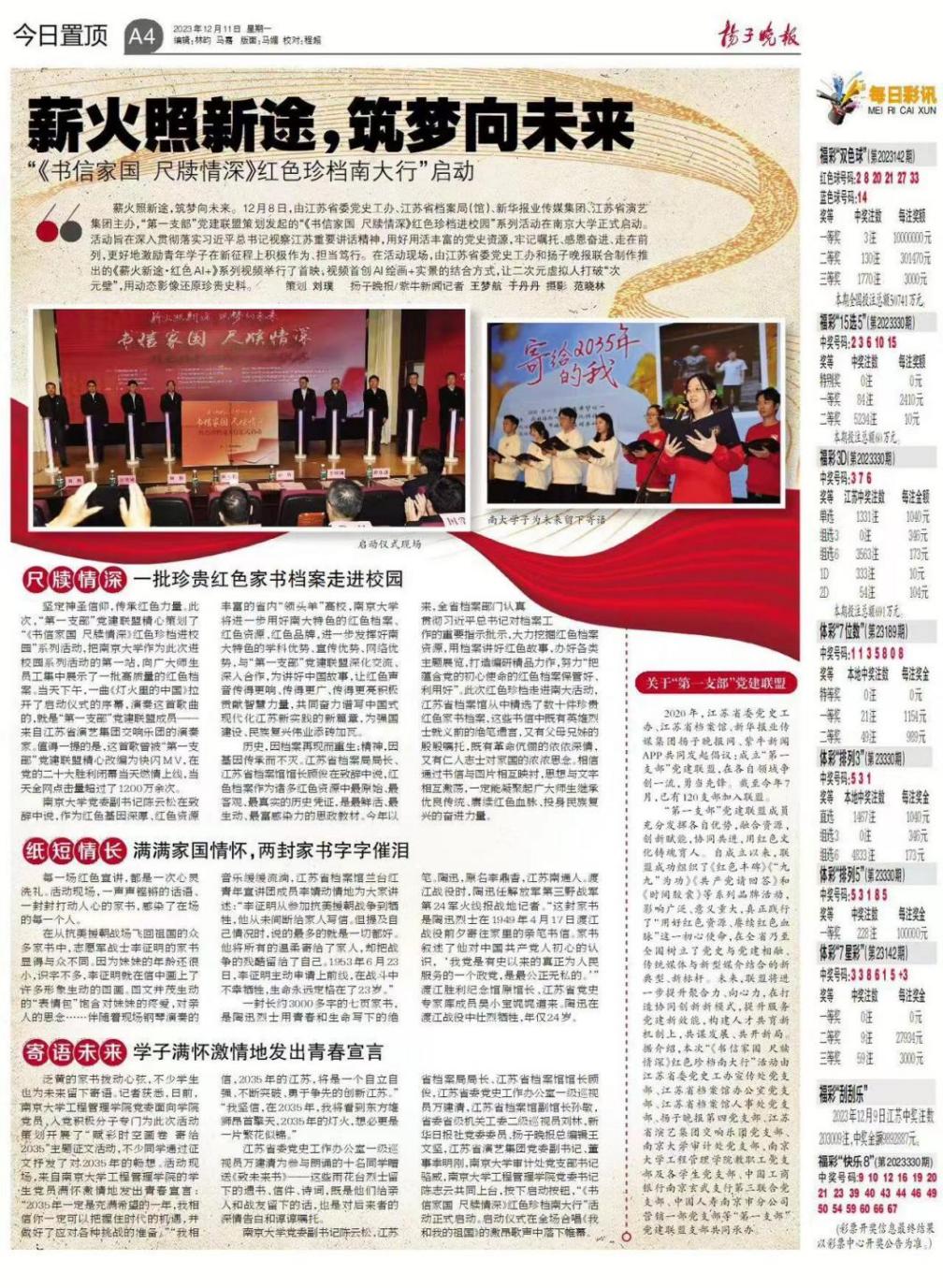 薪火照新途,筑梦向未来。12月8日,由江苏省委党史工办、江苏省档案局(馆)、新华报业传媒集团、江苏省演艺集团主办,“第一支部”党建联盟策划发起的“《书信家国 尺牍情深》红色珍档进校园”系列活动在suncitygroup太阳集团正式启动。活动旨在深入贯彻落实习近平总书记视察江苏重要讲话精神,用好用活丰富的党史资源,牢记嘱托、感恩奋进、走在前列,更好地激励青年学子在新征程上积极作为、担当笃行。在活动现场,由江苏省委党史工办和扬子晚报联合制作推出的《薪火新途 红色AI+》系列视频举行了首映,视频首创AI绘画+实景的结合方式,让二次元虚拟人打破“次元壁”,用动态影像还原珍贵史料。