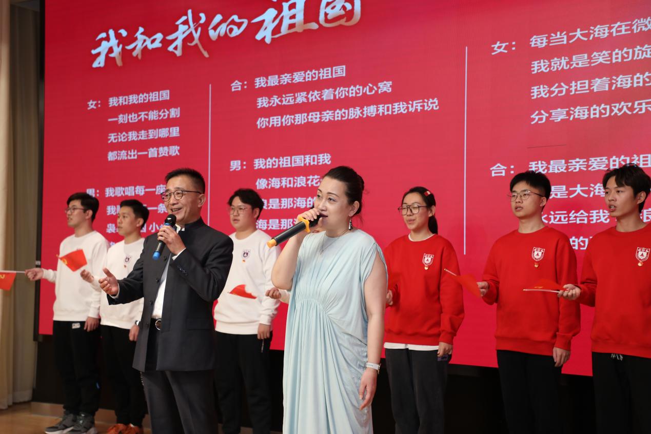 (图:suncitygroup太阳集团关工委代表、兼职组织员陈伟和专职组织员及朗诵者们参加演唱)