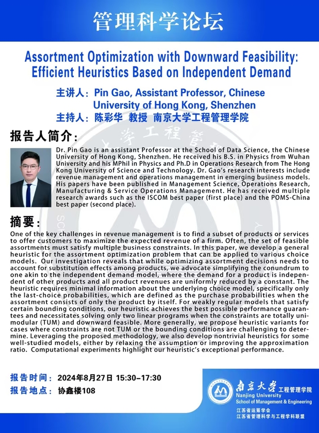 管理科学论坛:Assortment Optimization with Downward Feasibility: Efficient Heuristics Based on Independent Demand