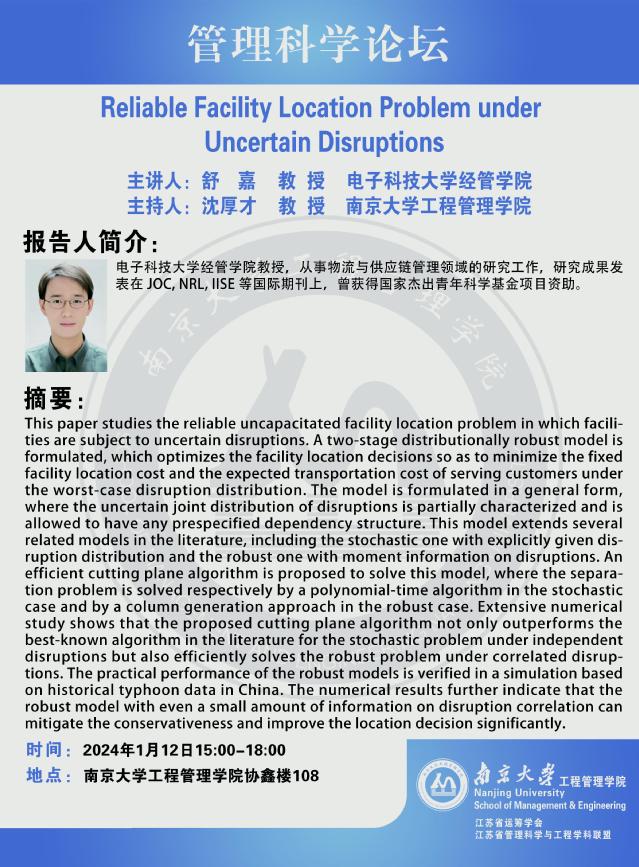 管理科学论坛:Reliable Facility Location Problem under Uncertain Disruptions